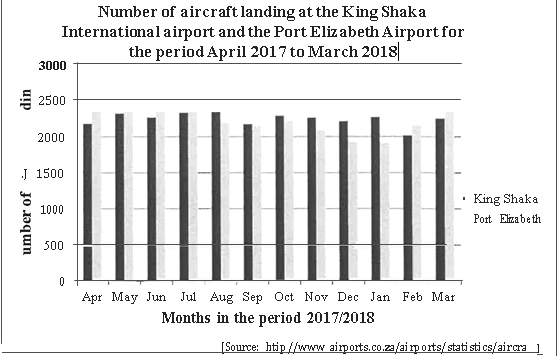 The number of aircraft landing at the King Shaka International Airport and the Port Elizabeth Airport for the period starting in April 2017 and ending in March 2018, is shown in the double bar graph below.