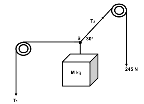 A pulley system is used to keep a crate of mass M kg stationary as shown on the diagram below.