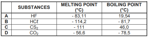 The melting points and boiling points of four substances (A, B, C and D) are shown in