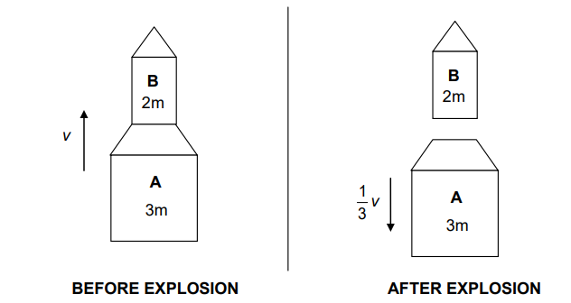 A simple rocket system consists of two parts, A of mass 3m, and B of mass 2m, as