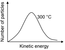 The Maxwell-Boltzmann distribution curve below represents the number of particles against kinetic energy at 300 °C.