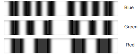 The experiment is now repeated with green light and then with red light. The distance between the light source and the slit remains constant during the investigation. The patterns obtained are shown in the diagram below.