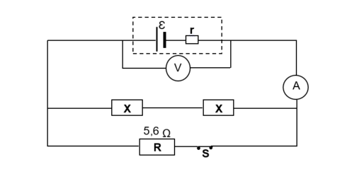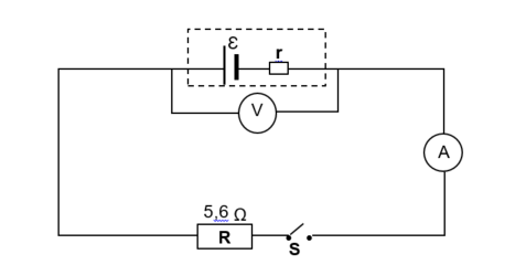 In the circuit diagram below, resistor R,with a resistance of 5,6 Ω, is connected,   together with a switch, an ammeter and a high-resistance voltmeter, to a battery with an unknown internal resistance, r.
